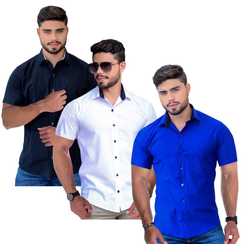 Kit 3 Camisa Social Masculina Manga Curta Slim Fit