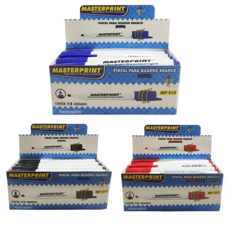 Pincel Quadro Branco Recarregável Caixa com 12 Unidades Cores Diversas Azul Vermelho Preto Masteprint