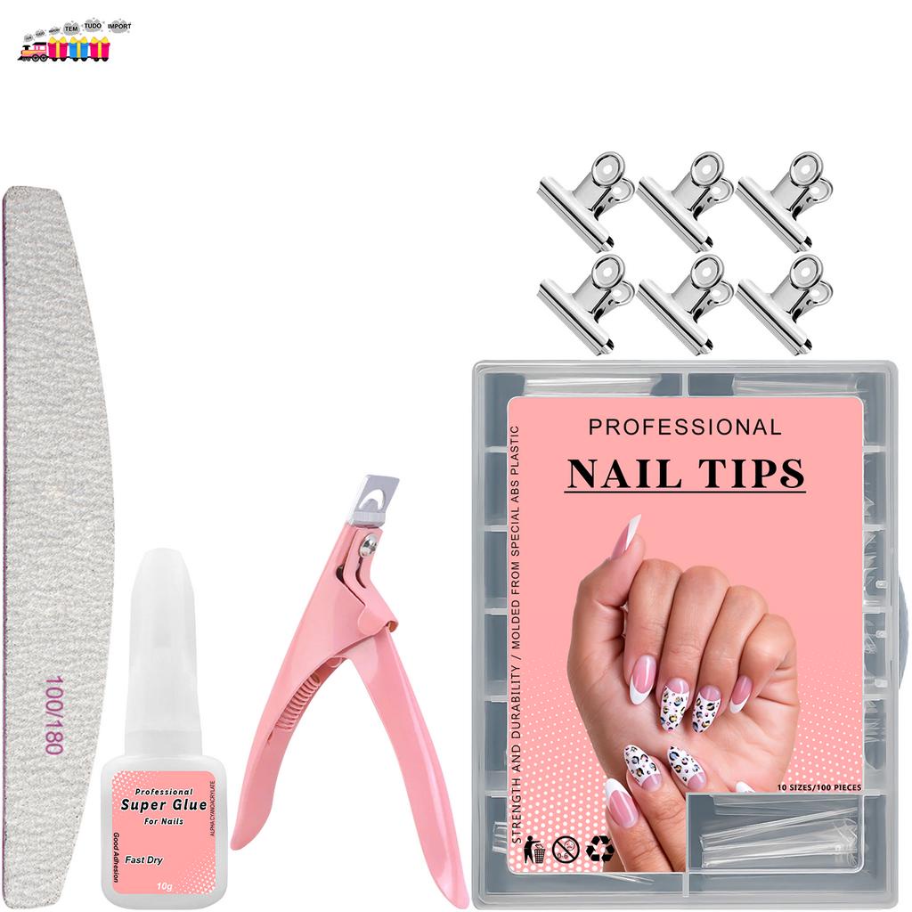 Kit Alongamento De Unhas Com 100 Tips + Alicate Cortador De Tips + Cola Pincel + Lixa De Unha 100 180