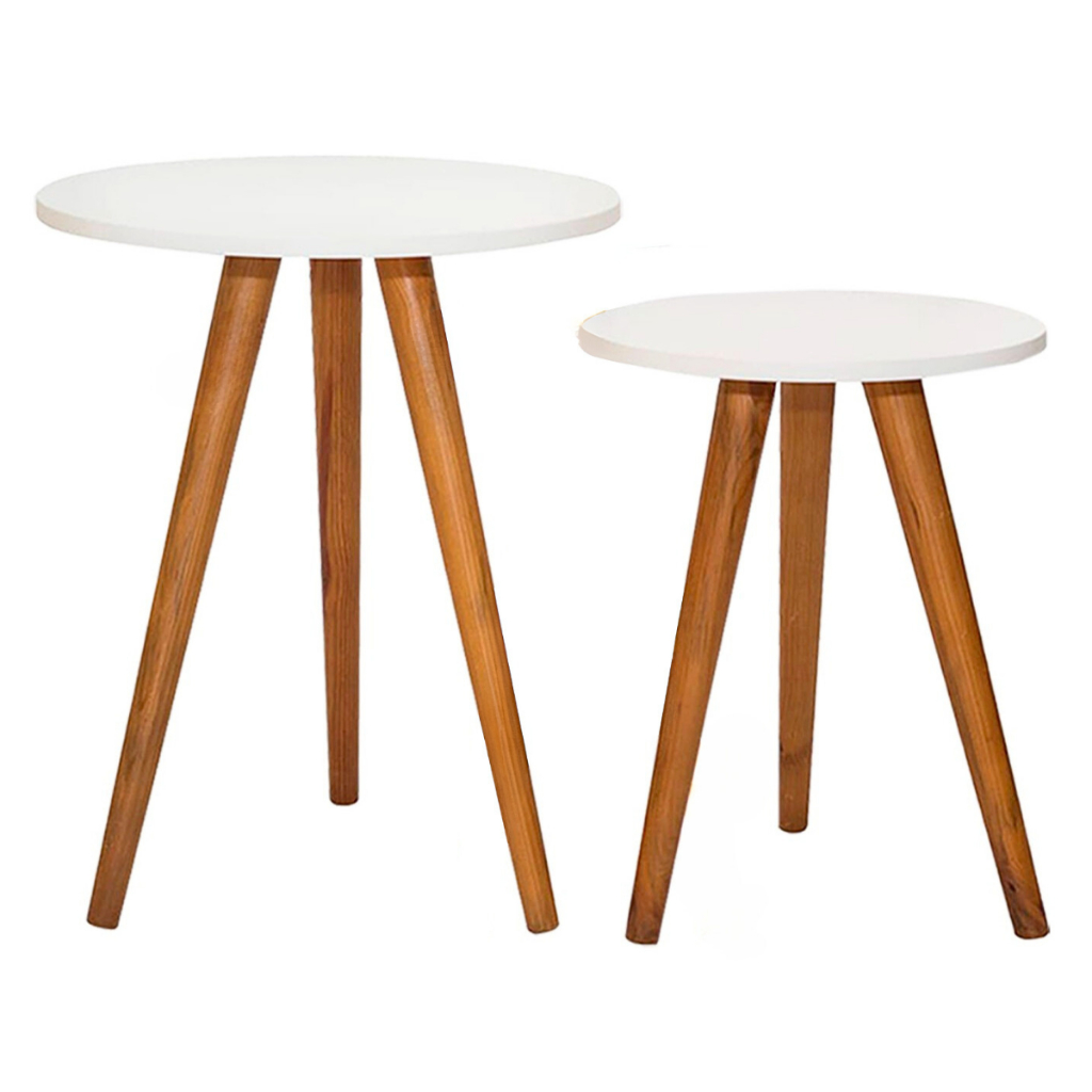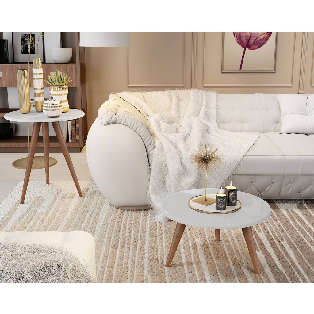 Conjunto de Mesinhas Centro e Lateral Pé Palito Tripe Kit Mesa de Apoio lateral Off White Freijó