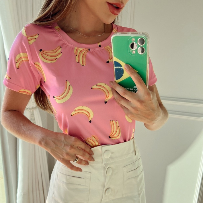 Tshirt Básica Blusa Feminina Camiseta Gola O Malha Suplex Estampada Bananinhas