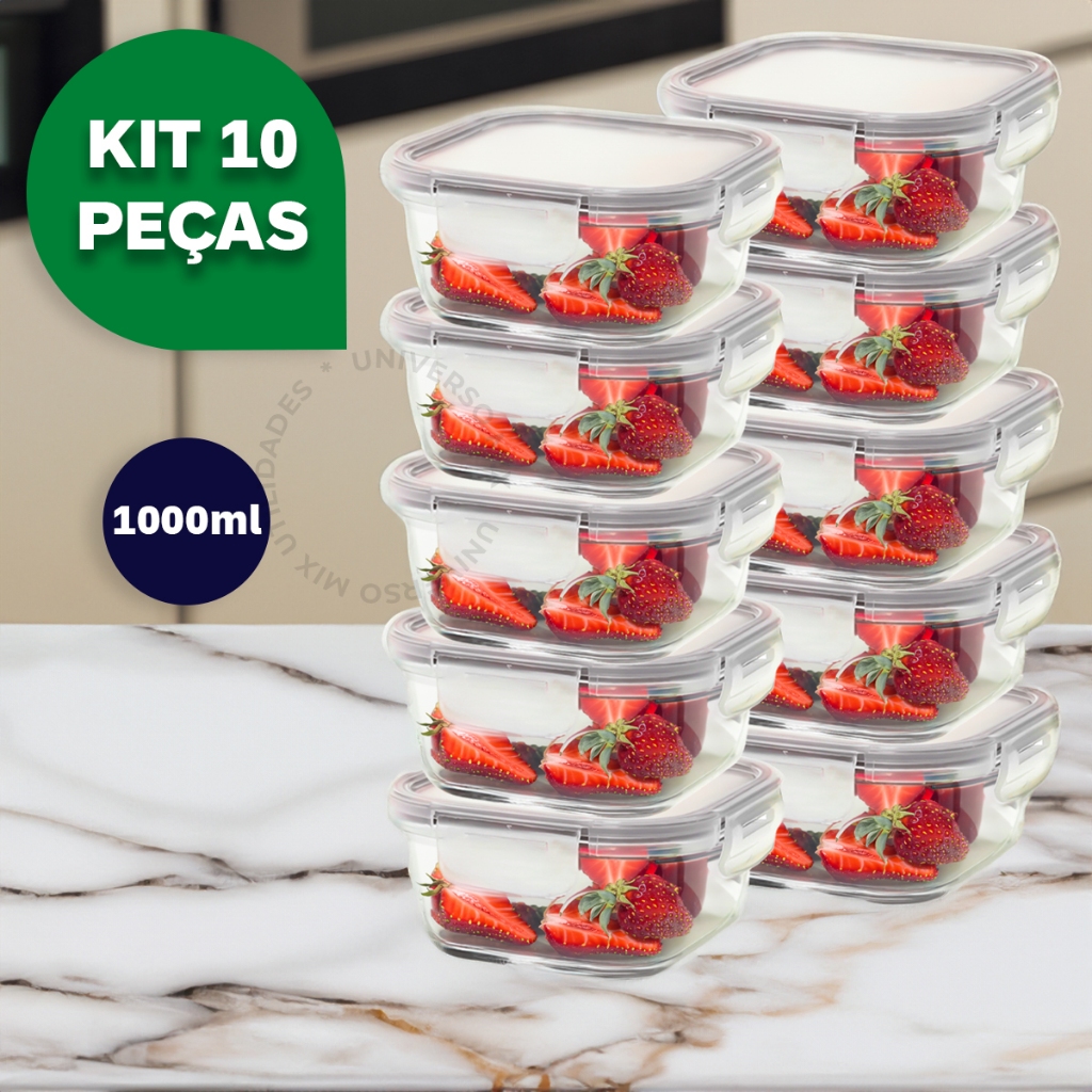Kit 10 ou 5 Potes Vidro Hermético 1000ml Quadrado Tampa Com Trava