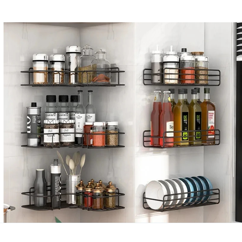 Kit 2 Prateleiras organizadora de canto cantoneira multiuso de ferro aramado suporte de metal com gancho em adesivo para Parede Cozinha