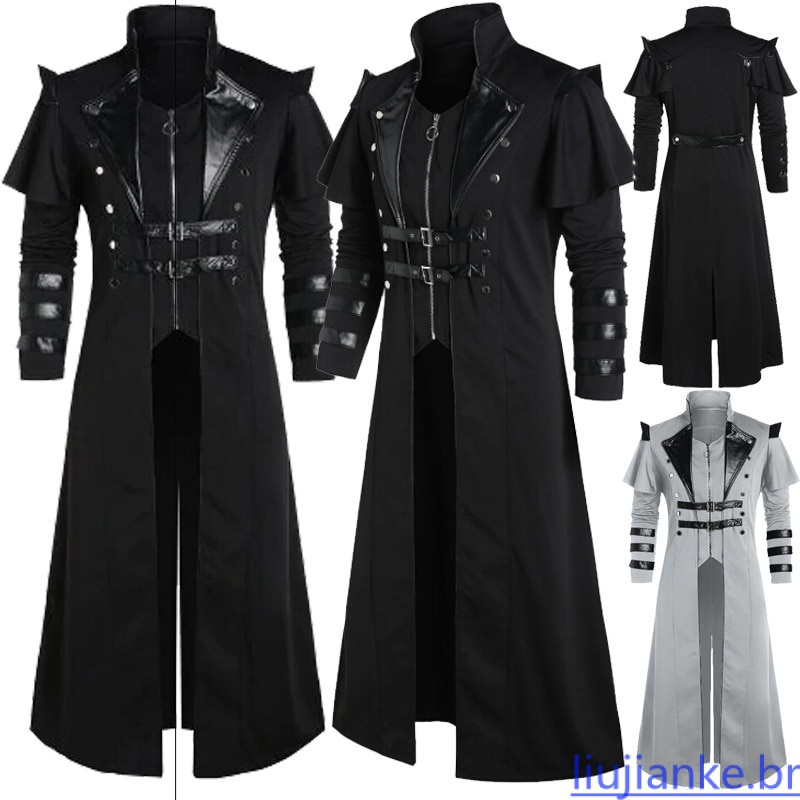 Casaco De Couro Vintage Halloween Medieval Steampunk Assassin Elves Pirata Fantasia Adulto Homens Preto Jaqueta Longa Dividida Gótica Armadura Casacos