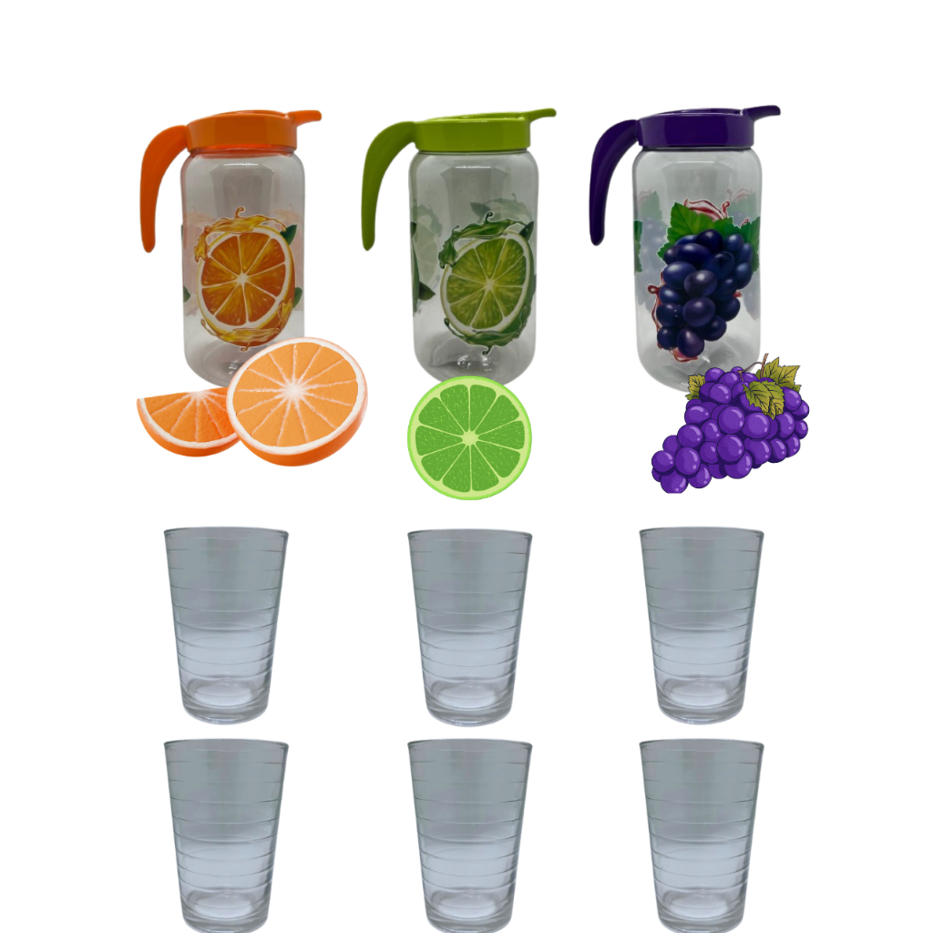 Jogo De Jarra 1,5L de Plastico Com 6 Copos 190ml Em Vidro Para Água Suco Drinks
