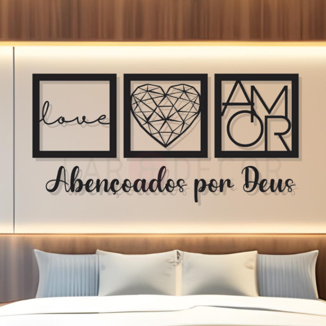 Kit 3 Quadros Decorativos Abençoados por Deus Love e Coração Geométrico Amor + Frase para Quarto Sala feito em MDF