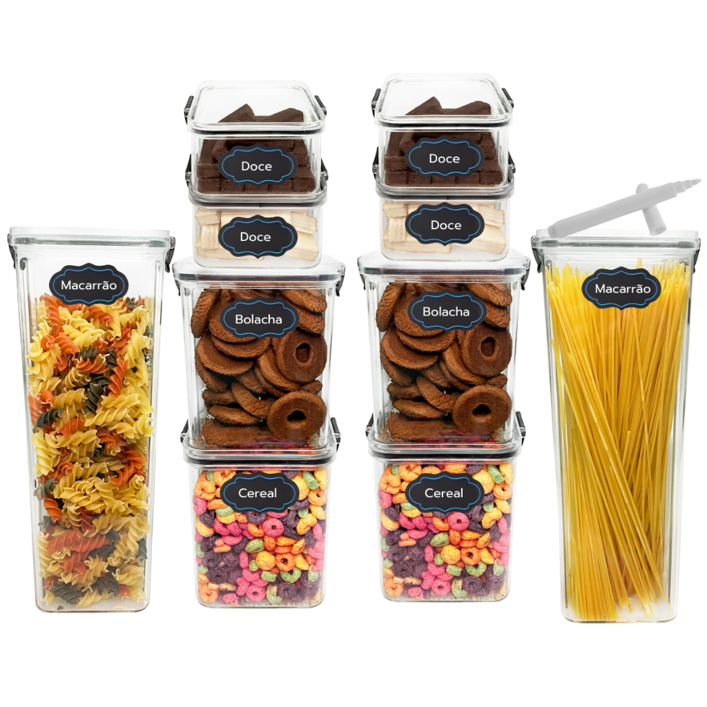 Super Jogo 10 Potes Herméticos Resistente com Trava Empilhável P/ Alimentos e Mantimentos