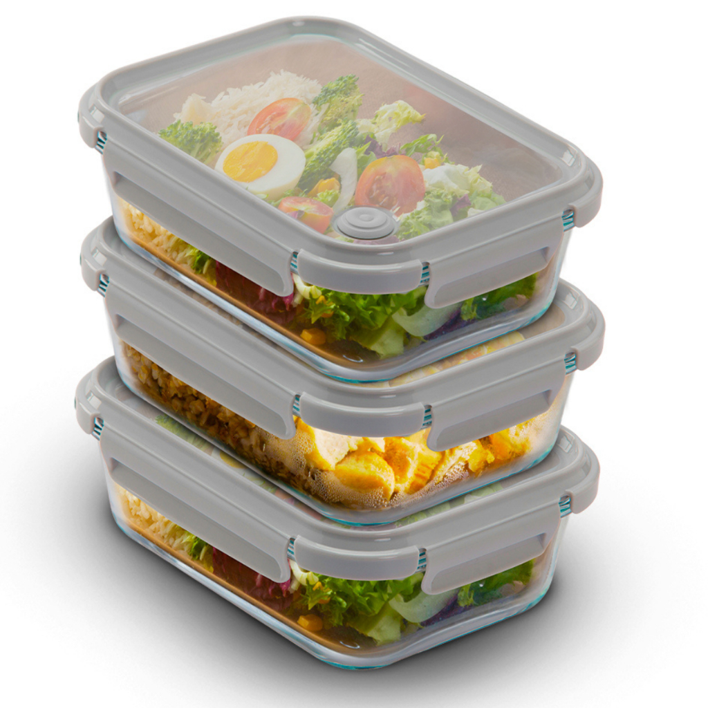Kit 3 Potes Vidro 1040ml Grande Hermético Com Tampa 4 Travas E Válvula De Respiro Marmita Fitness