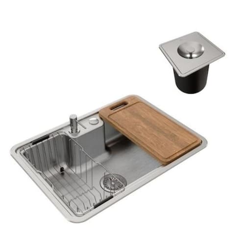 Cuba de Embutir/Sobrepor Massima 68x48cm Em Aço Inox Com Lixeira de Embutir 6L, Tábua de Madeira, Dosador de Sabão, Ces