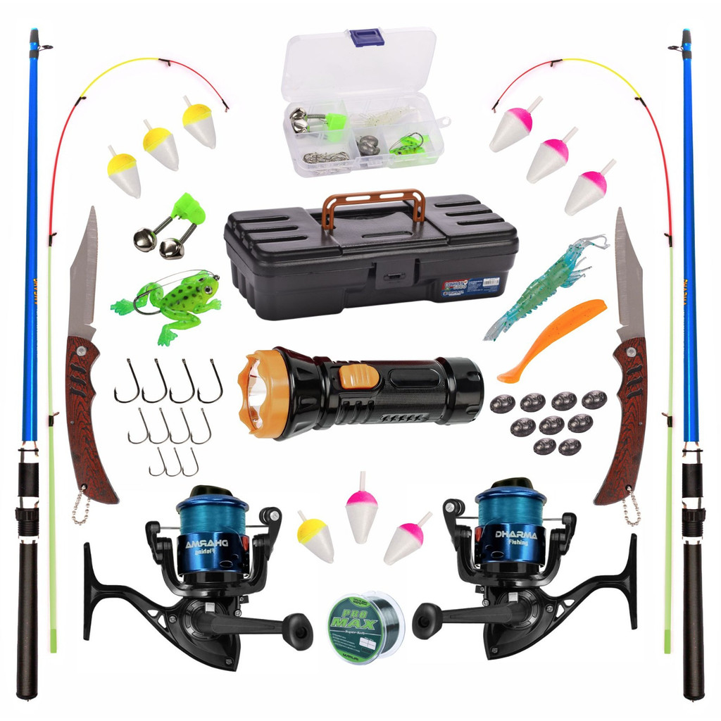 KIT DE PESCA COMPLETO 10KG C/ 2 VARAS FLEXIVEIS + 2 MOLINETES + LANTERNA + ITENS