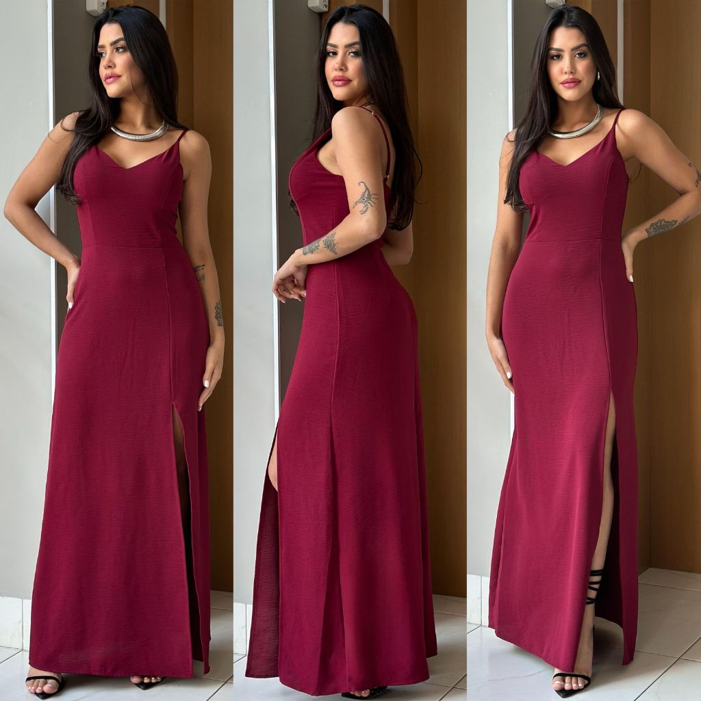 Vestido longo feminino costa fechado com fenda decote v alça ajustavel moda elegante lançamento