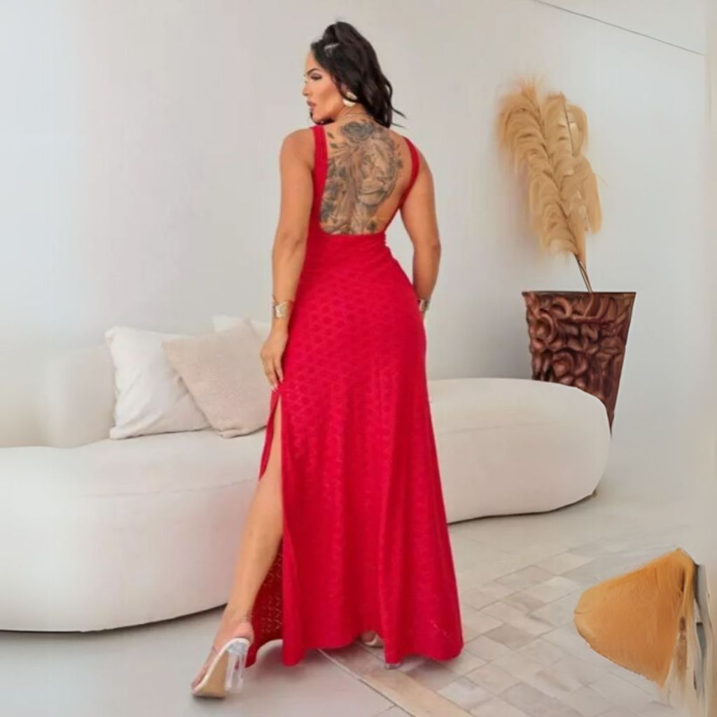 Vestido Feminino Justo de Costas Nua Longo Decote Costa Casual Estiloso com Fenda