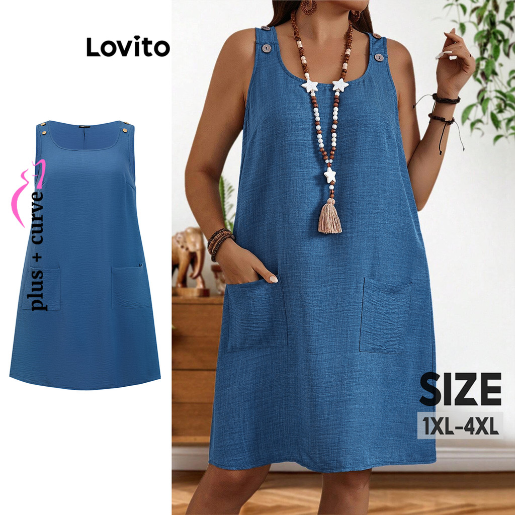 Lovito Vestido Plus Size Curvo Casual Simples com Bolso de Botão para Mulheres LBL18749