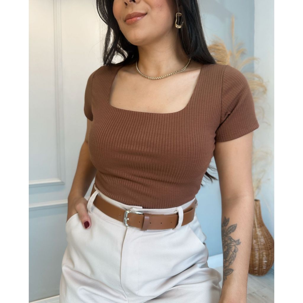 Blusinha Feminina Decote Quadrado Canelada Básica Blusa Elegante Dia a Dia Manga Curta