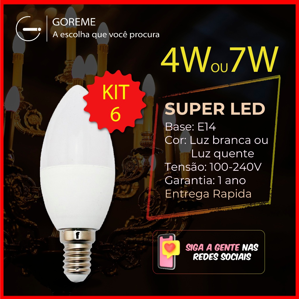 Kit 6 Lâmpada led para Lustre Vela Fosca 4W / 7W E14 Decoração Bivolt Branco Frio 6500K (Luz Branca) | Branco Quente 3000K (Luz Amarela)