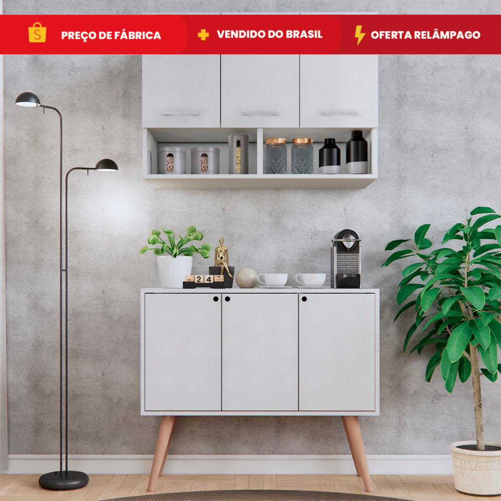 Conjunto Armário Suspenso 3 Portas e Balcão Cozinha Com Pes de Madeira Retrô Móveis Bonatto