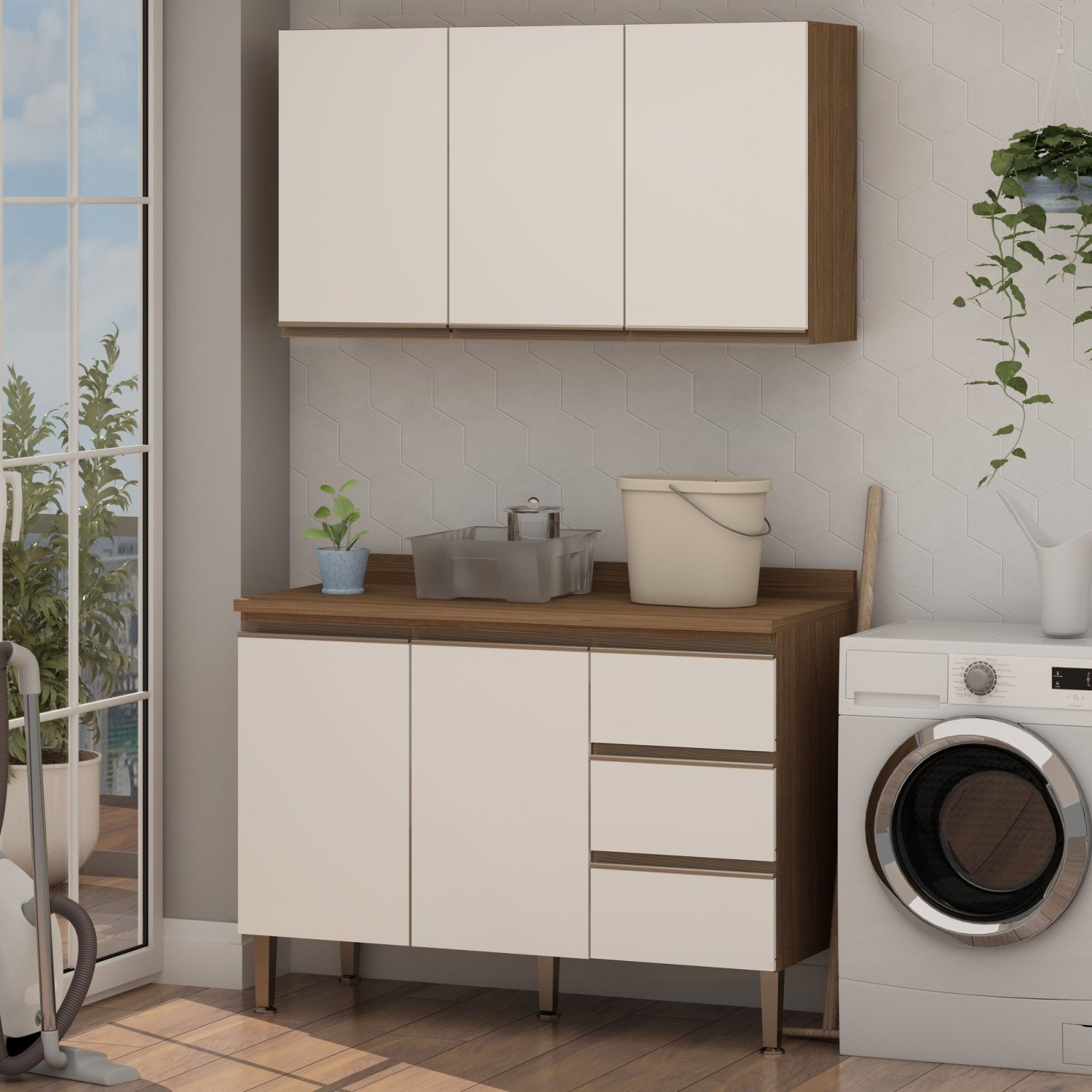 Conjunto para Área de Serviço com Balcão 2 Portas e 3 Gavetas e Armário Aéreo 3 Portas Low Dry