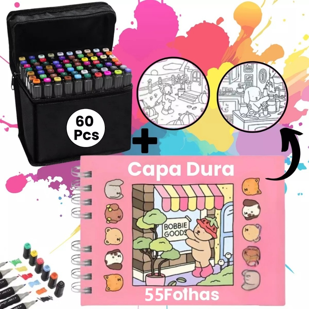 Kit Livro De Colorir Bobbie Goods Capa Dura 50 Páginas + Canetinhas Ponta Dupla Marca Texto 24/36/48/60/80/120 Escolar