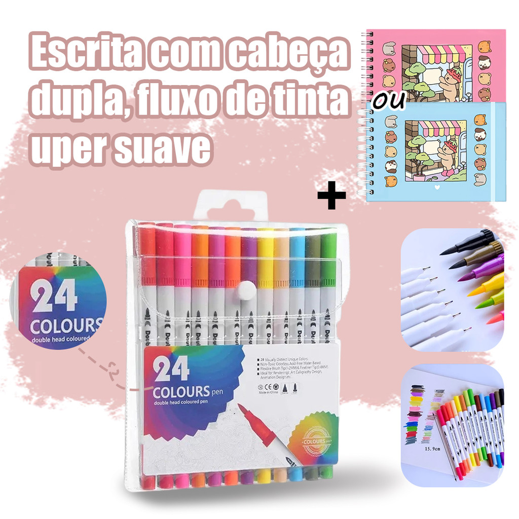 Kit Livro De Colorir Capa Dura 50 Páginas + Canetinhas Ponta Dupla Marca Texto 12/24/36/48/60/80
