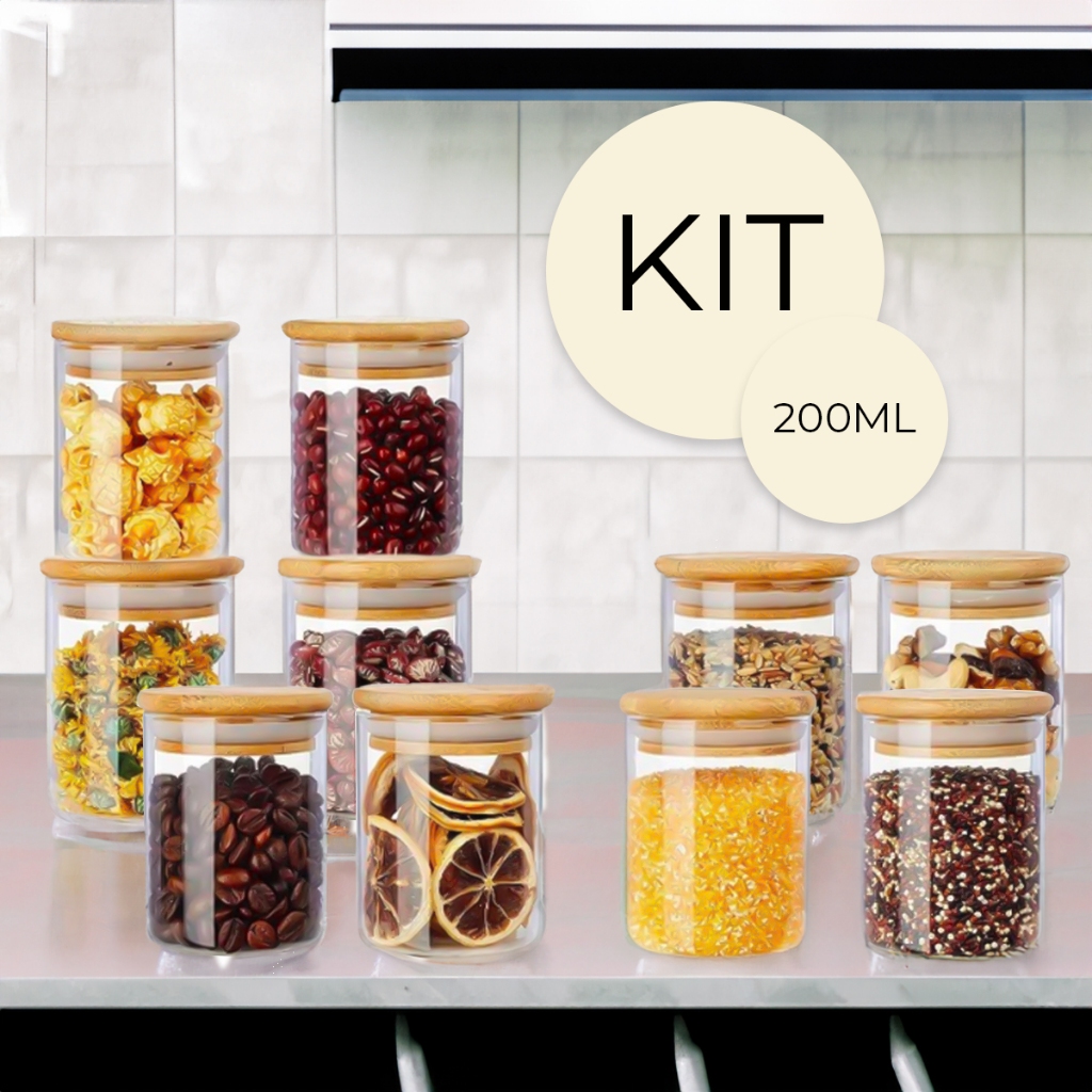 Kit 10 potes de vidro com tampa de bambu herméticos para mantimentos empilháveis 200ml - Oikos