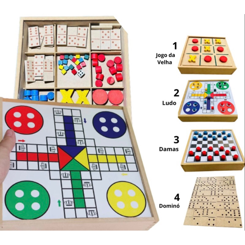 Jogos Tabuleiro 4 Em 1 com Dama jogo da velha Ludo Dominó Caixa De Madeira