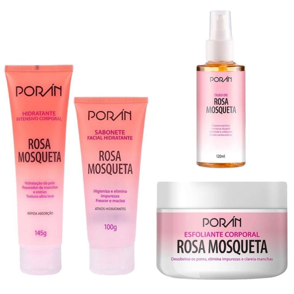 Kit Cuidados com Corpo e Rosto Sabonete Hidratante Esfoliante Óleo Rosa Mosqueta Porán