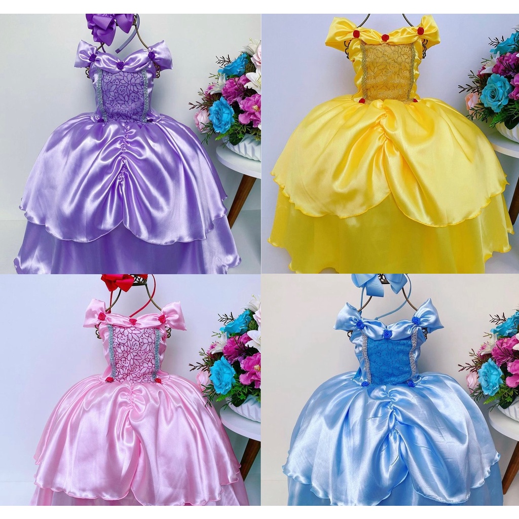 Vestido Longo Clássico Princesa Rapunzel Bela Cinderela Elsa Adormecida Sofia Fantasia