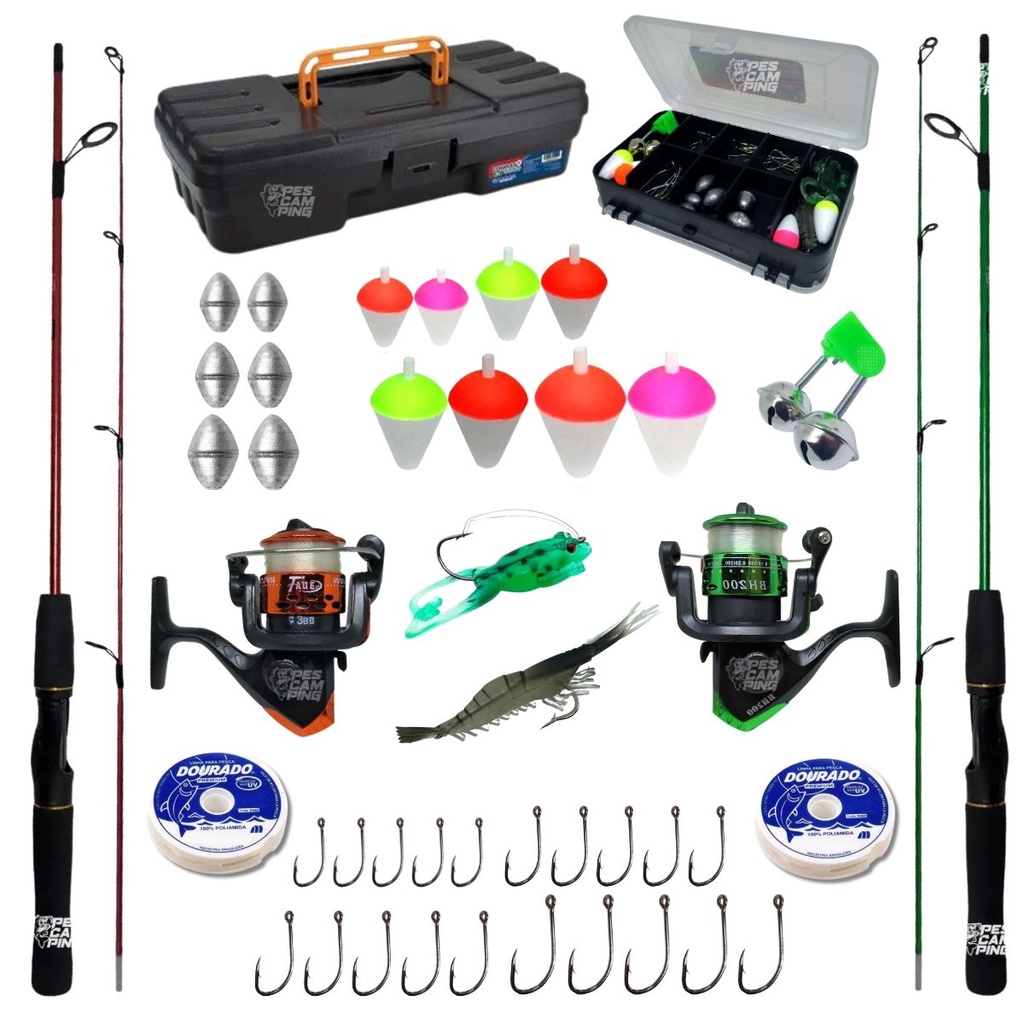 Kit De Pesca Barato 2 Varas 10 Kgs Fibra de Vidro + 2 Molinetes e Acessórios Iscas, Bóias e mais