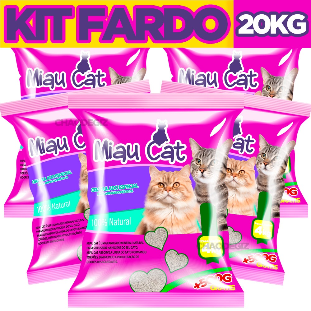 Kit Fardo Com 5 Pacotes de Areia Sanitária Antiodor Granulado Tira Cheiro Pet Miaucat Para Gatos Lavanda e Tradicional 100% Natural Forma Torrões 20KG