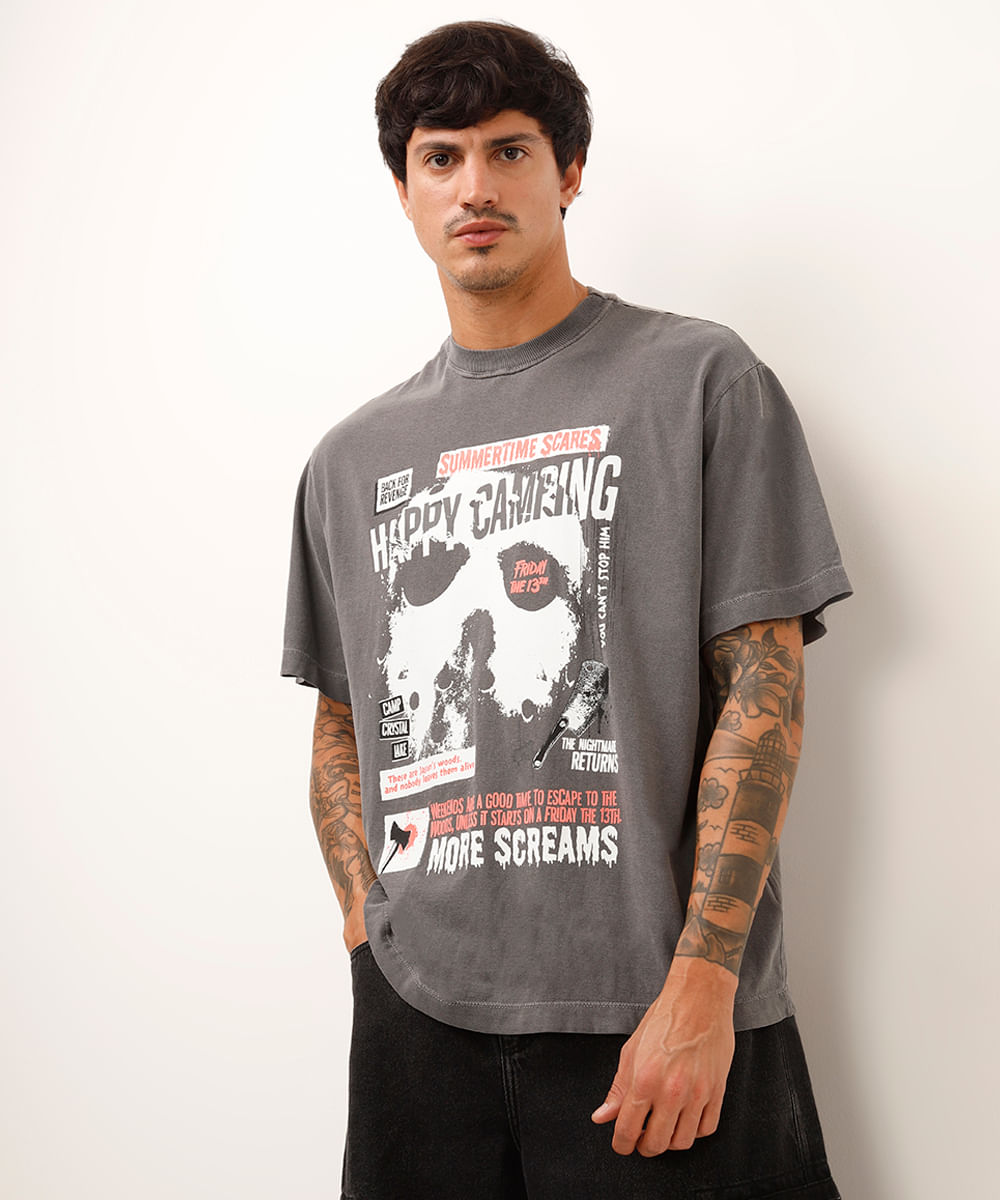 camiseta de algodão sexta feira 13 cinza