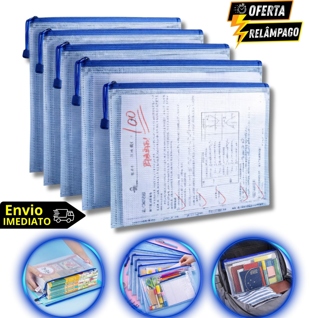 Kit 5 Pasta Organizadora de Documentos A4 Plástico PVC com Ziper Material Escolar Saco Maternidade