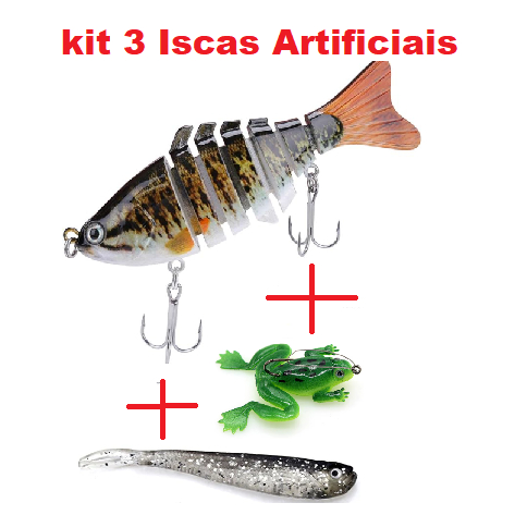 kit 3 iscas artificiais - 1 lambari articulado 7 segmentos +1 frog anzol 4cm + 1 isca soft 7cm prata