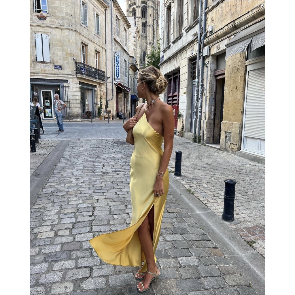 2025 Verão Novo Vestido De Cetim Amarelo Luxo Sentimento Aberto Nas Costas Longo Férias