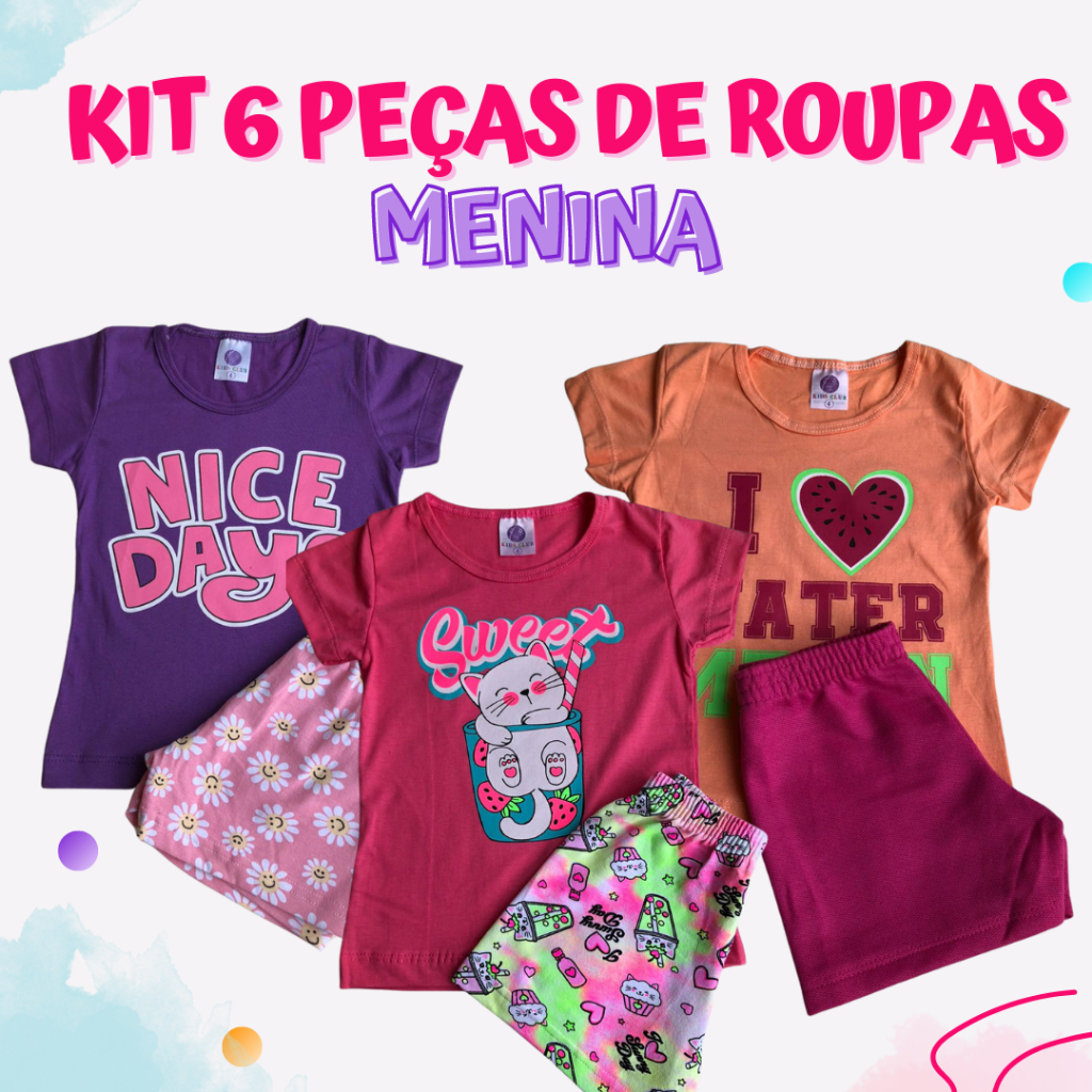 Kit 6 Peças de Roupas Infantil, Conjunto Menina | Conjunto Menina Verão| 3 Camisetas | 3 Shorts Estampados Tamanho 2 ao 12 | 3 Conjunto Infantil Criança Promoção Envio Imediato