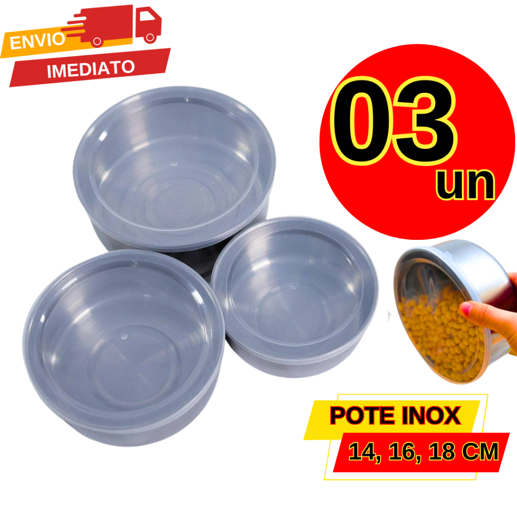 Kit 3 Tigela Pote Inox Tampa Resistente para Armazenamento de Alimentos e Ingredientes para Cozinha