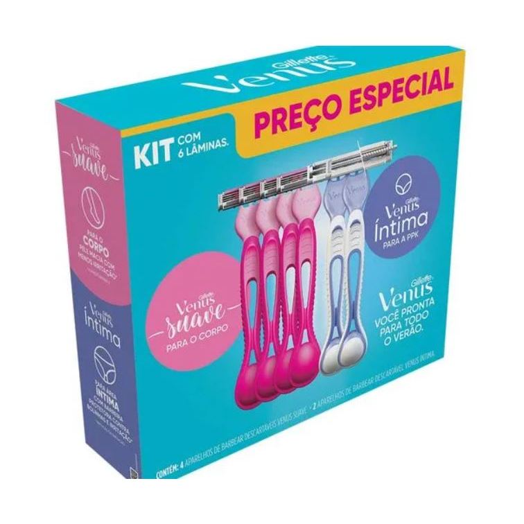 Kit Gillette Vênus Suave 06 aparelhos (4 para corpo e 2 Vênus Íntima) Cuidado com a mulher depilação