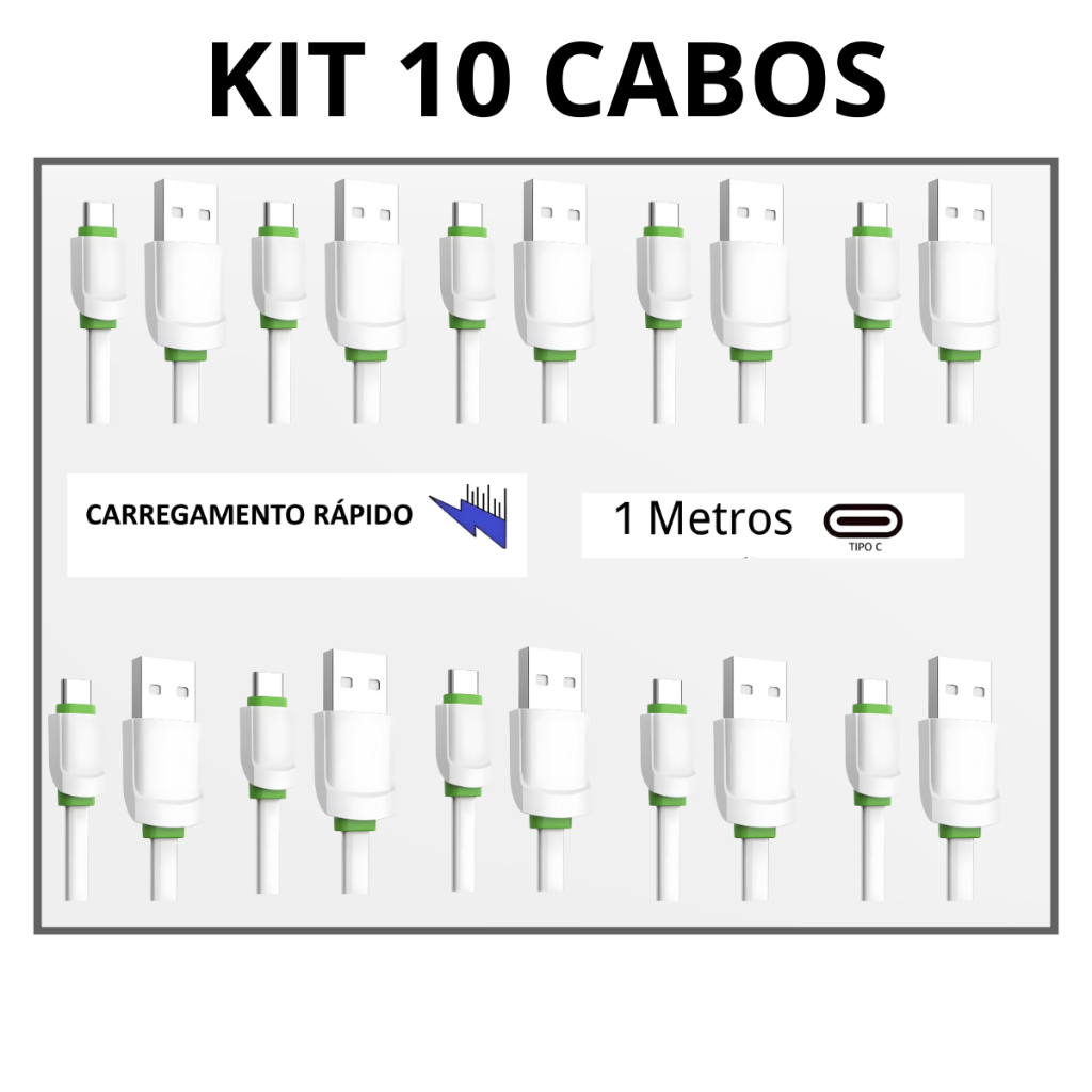 Kit Atacado 10 Cabo Carregador Usb Dados Typec Kapbom Tipo c carga Turbo 4.8A Achatado Ka-370-Ty