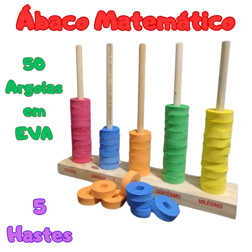 Ábaco Matemático Escolar em Madeira c/ 50 Argolas Coloridas em Eva Brinquedo Educativo Pedagógico Lúdico