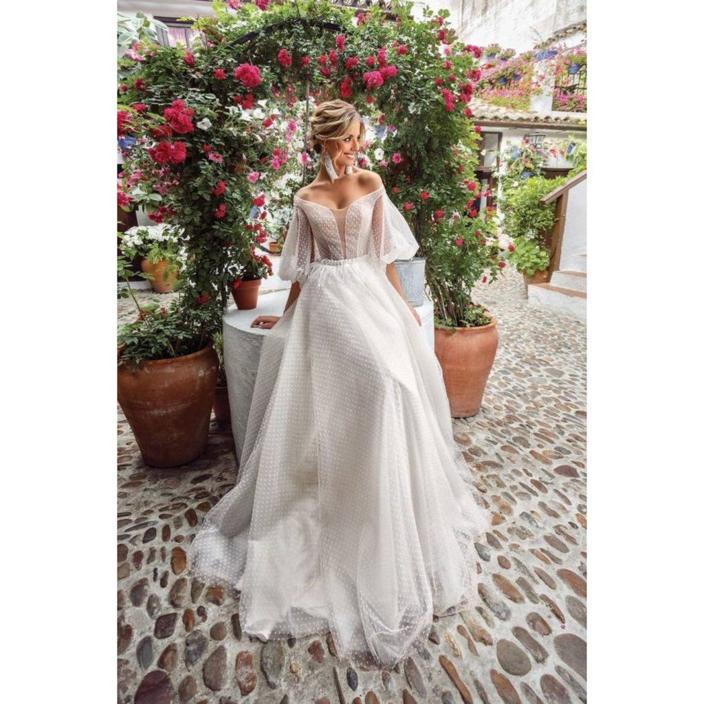 Vestido de noiva com mangas bufantes decote ombro a ombro e saia princesa Achillea