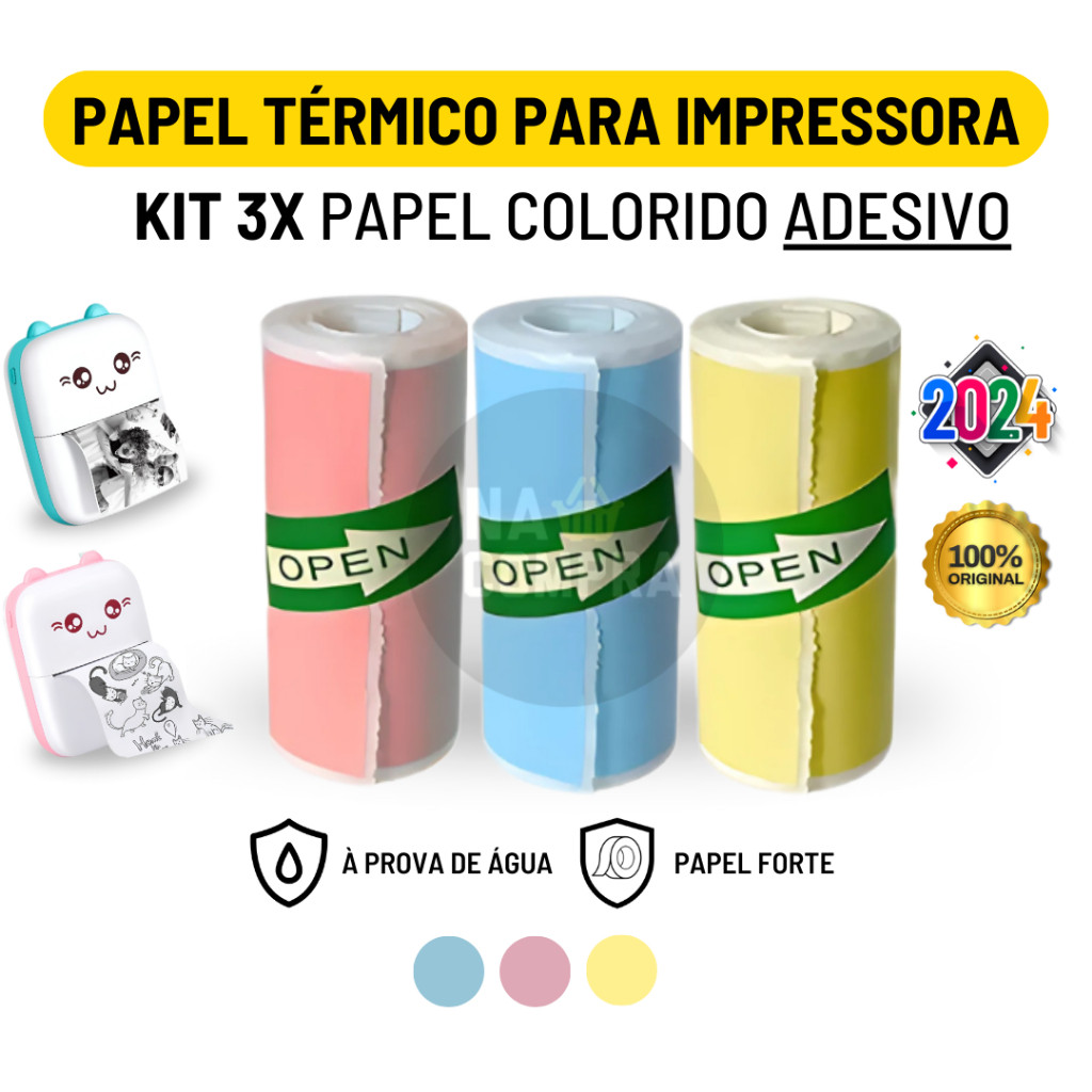 Kit 3 Bobina Rolo Etiqueta Térmica Adesiva 57mm Colorida Mini Impressora Portátil | Envio Imediato
