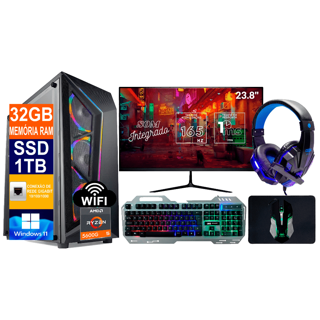 Pc Gamer Computador Cpu Ryzen 5 5600G / SSD 1TB M2 NVME / 32gb Memória Ram DDR4 / Monitor 23.8p 165HZ Gamer + Teclado e Mouse / Fonte 500W / Windows 11 Pro