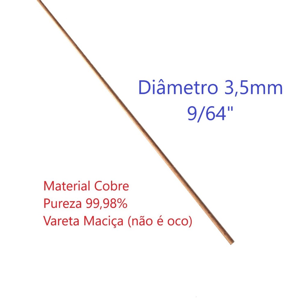 Vareta Cobre Puro 3,5mm x 50cm (9/64") Arame Maciço (Não é Aço Cobreado, é só Cobre mesmo)
