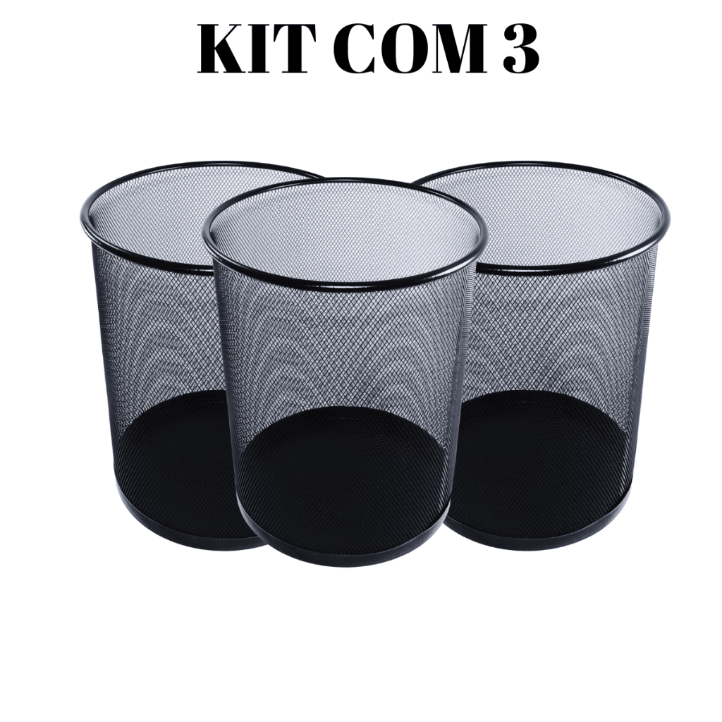 kit com 3 Lixeira metal telado cesto 10 litros aramado preto home office quarto escritório sala banheiro cestos moderna