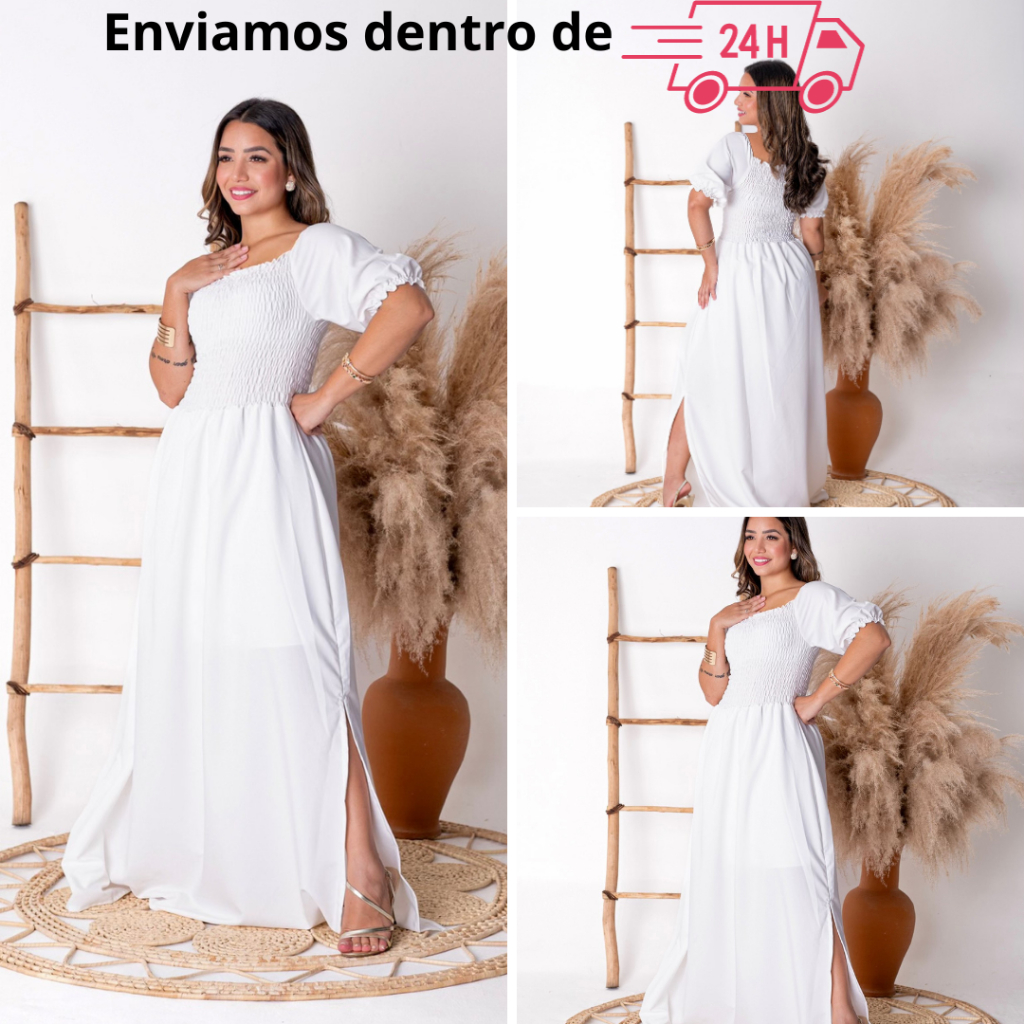 Vestido femino branco longo com fenda e lastex varios modelos
