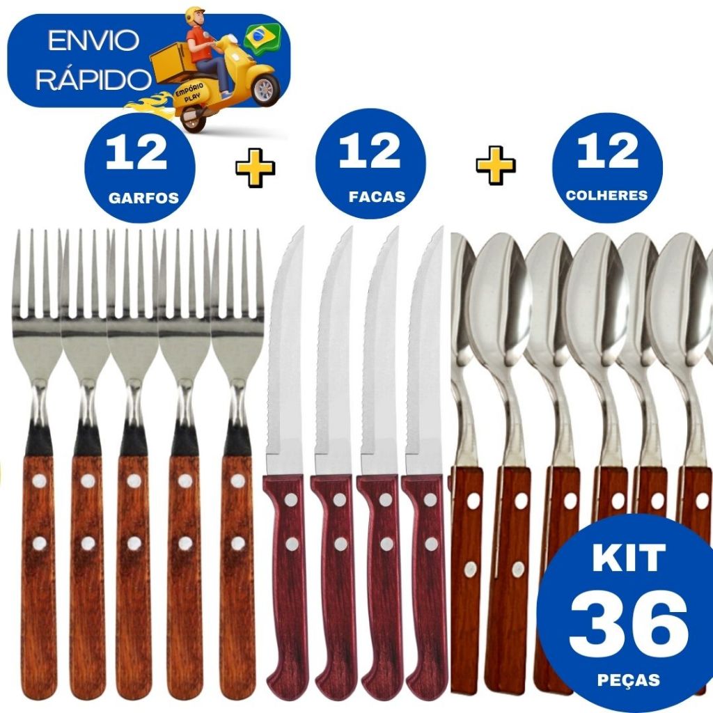 Kit 36 Peças Jogo De Talher 12 Garfo 12 Faca 12 Colher De Inox Com Cabo De Madeira Faqueiro Jogo Conjunto Casa Cozinha
