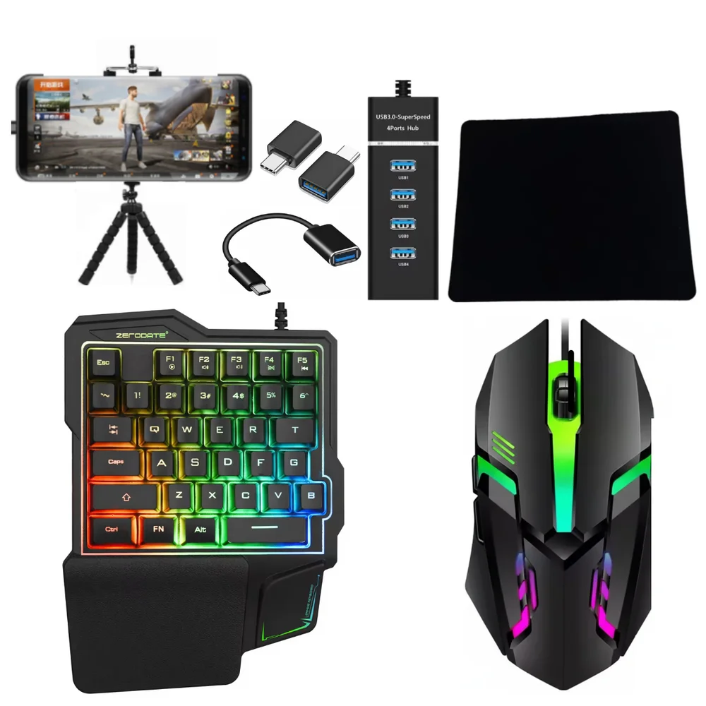 Kit Mobilador Gamer Completo Teclado One Hand Uma Mão Mouse Mousepad Suporte Para Celular