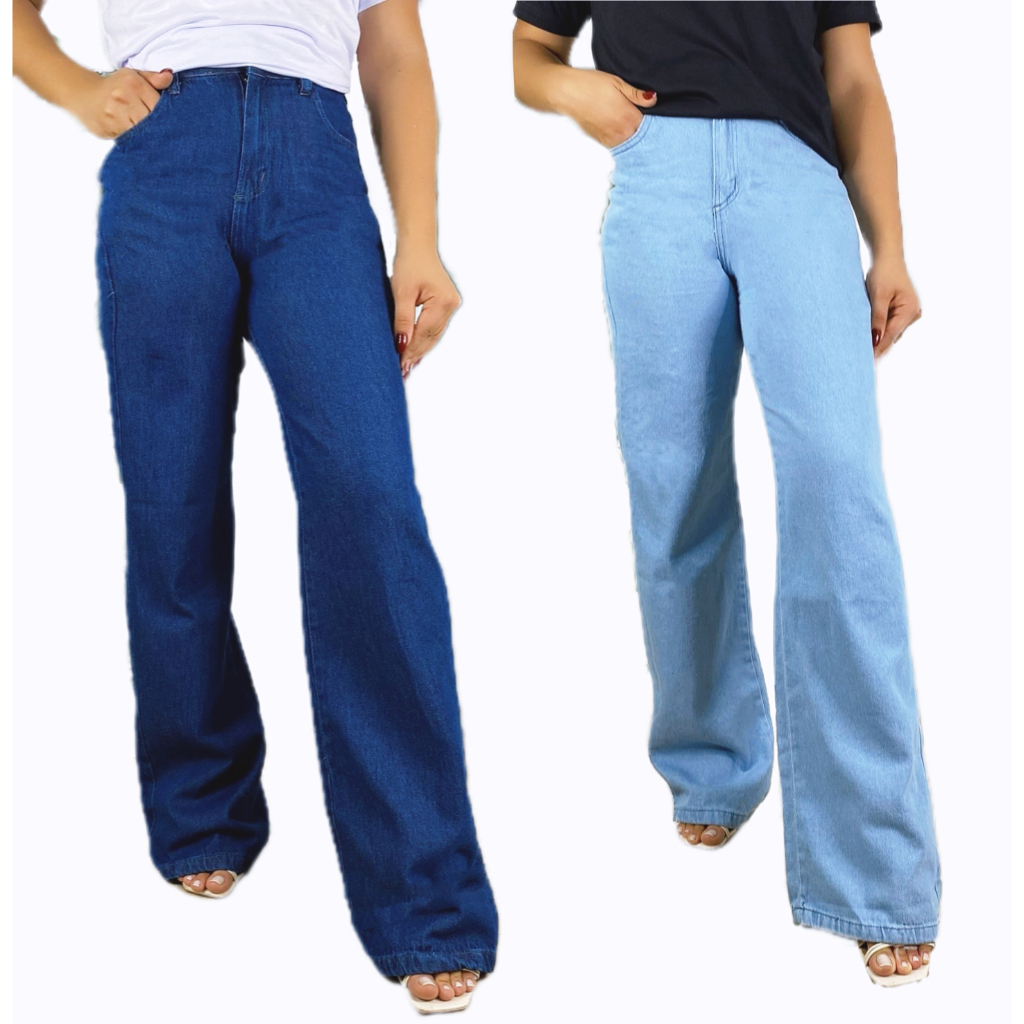 Kit 2 Calça Jeans Feminina Wide Leg Cintura Alta Tecido Grosso Pantalona Linha Premium 100% Algodão