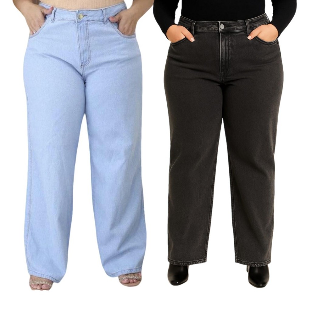 KIT/2 Calças Jeans Feminina Wide Leg Plus Size Cintura Alta
