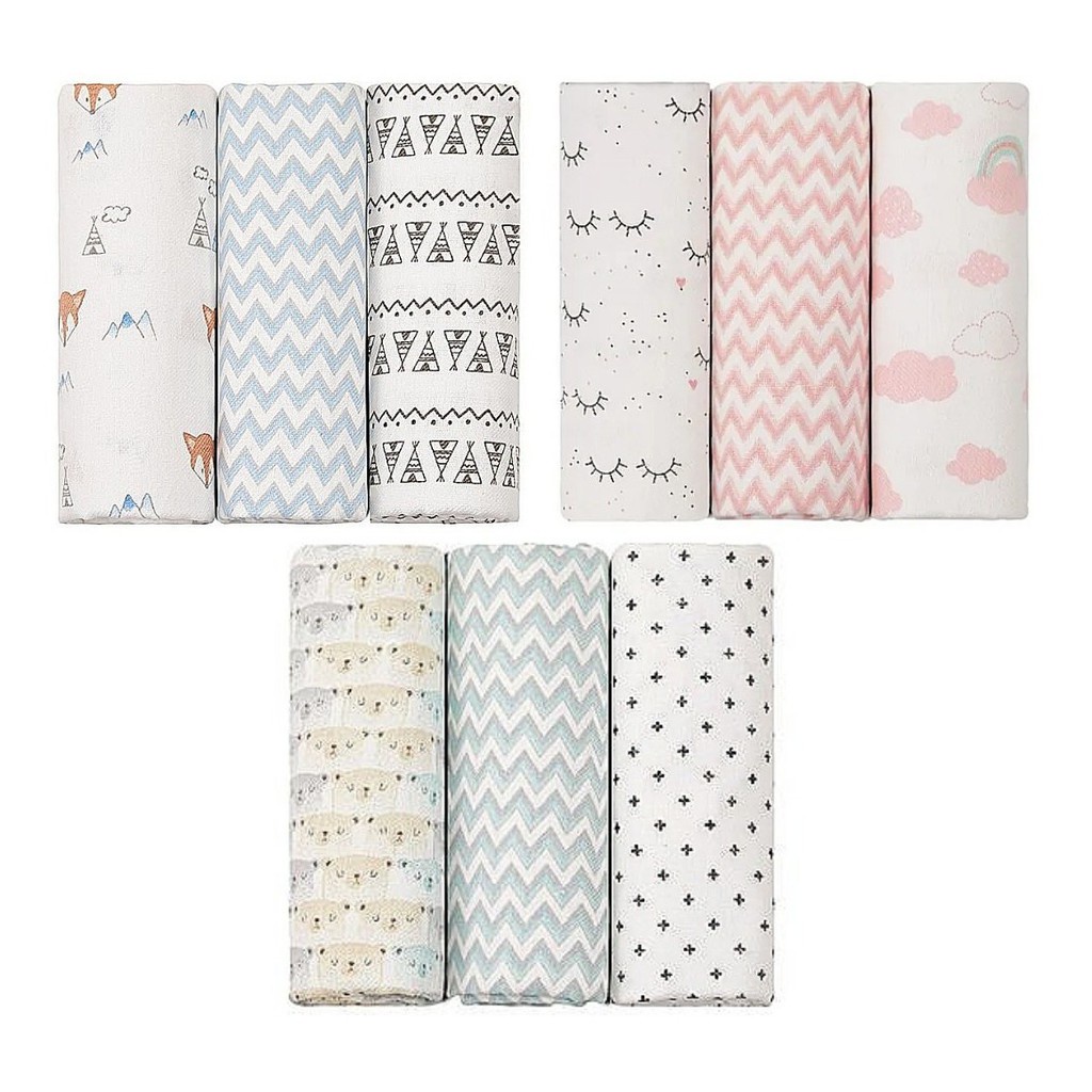 Kit 3 Unidades Cueiro Bebê Manta Estampado e Flanelado Para Bebê 1,0 m x 80 cm 100% Algodão Papi Baby