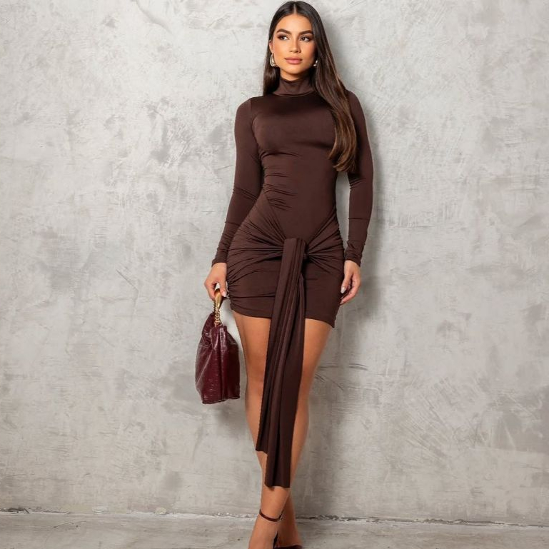 Vestido Moda Blogueira Feminino Gola Alta Manga Longa Suplex com Detalhe no Quadril